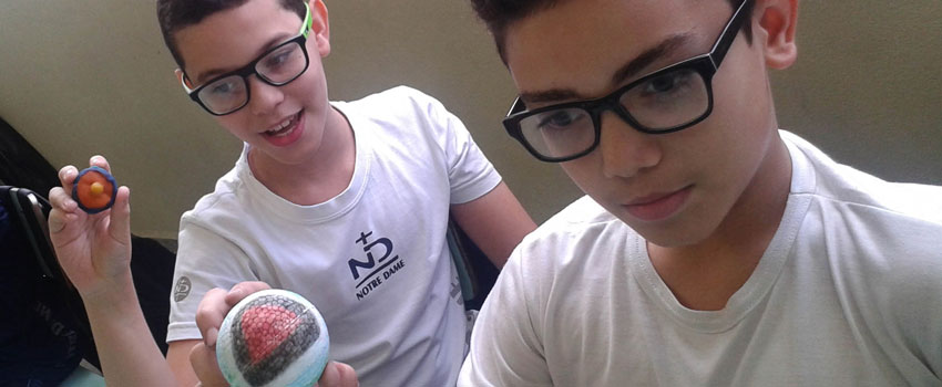 Utilizando isopor, papel, massa de modelar e tintas de diversas cores, eles representaram o planeta e destacaram as camadas que o compõem: a Crosta Terrestre – camada superficial, onde existe vida -, o Manto – camada mais extensa, encontrada nos estados sólido e pastoso -, e o Núcleo – constituído por níquel e ferro, com temperatura aproximadamente de 4000°C. Na superfície do planeta, os estudantes fixaram, ainda, representações dos continentes e dos oceanos.