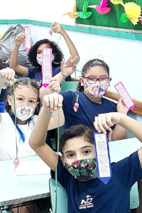 Ornamentado com pirulitos que pendiam do teto, num convite para que as crianças se servissem da guloseima, o Colégio Notre Dame Ilha as presenteou com espontâneos sorrisos que, mesmo sob a máscara de proteção individual, se deixavam vislumbrar.